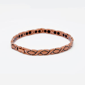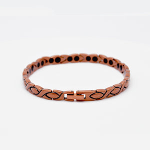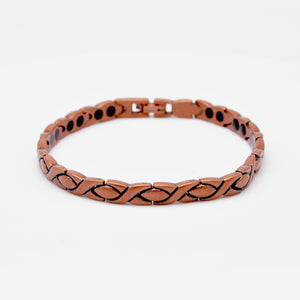 This bracelet is the darker copper version of the Celeste copper magnetic bracelet and it is just as stunning and delicate. Darker copper is plaited in the same style with an intricate rope pattern all along the bracelet. This delicate, elegant yet robust copper bracelet is dotted with our full-strength magnets giving the wearing optimum health benefits and a stylish and feminine look. This copper bracelet with magnets can be adjusted with its links and has a strong fold over clasp to keep this copper bracelet secure.