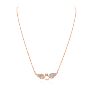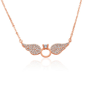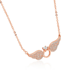 Elegant and shimmery this cute and charming necklace is the ultimate must have. The necklace consists of a classic ring in rose gold with a diamante rock on top, either side of the ring are two rose gold diamante encrusted wings. All of which is then delicately hung on a rose gold chain. Gorgeously stunning this necklace can be worn with any outfit on any occasion.