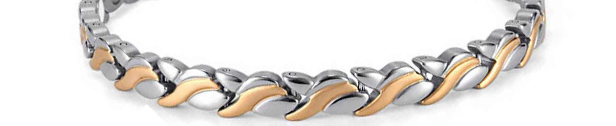 This magnetic bracelet for women really does blend style with health benefits. Gold rectangular links are surrounded by silver links and extra texture on the gold links adds further attention to detail.