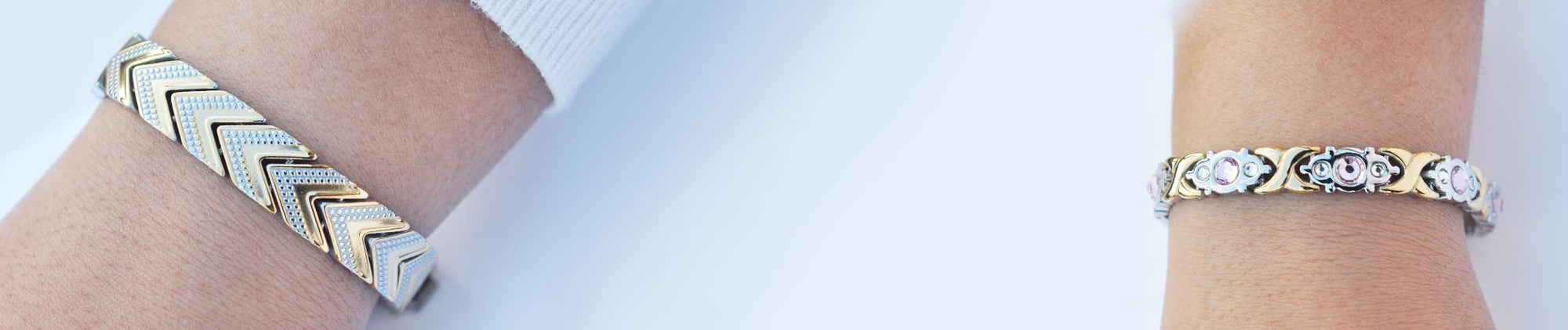 These ladies’ silver bracelets have a classic and timeless appeal. The delicate diamond pattern combines silver stainless steel and gold accents to create a truly magnificent magnetic wristband. This bracelet has the dual benefits of being a gorgeous health bracelet, while reaping the natural healing powers of magnetic therapy. A classic designed health bracelet, that would look fabulous in any jewellery collection.