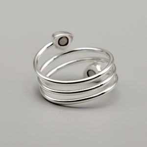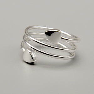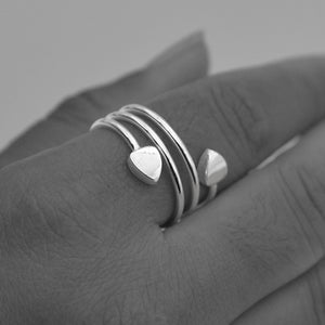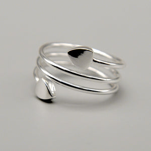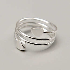 This striking and unique spiral wrap ring is made from copper with a vibrant silver finish and two small heart shape designs on the ends.