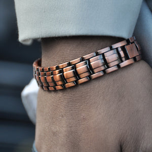 ALPHA LOGOThis striking and statement magnetic link bracelet is a head turner. Light and oxidised copper plating is combined in this magnetic bracelet to give it definition and depth. The links in this copper plated magnetic bracelet are all different sizes and are placed horizontally and vertically which adds an extra element of originality to this magnetic bracelet.