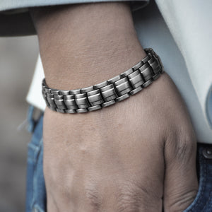 ALPHA LOGOMasculine and robust our pewter magnetic link bracelet is an ideal chunky statement piece. This classic and timeless magnetic bracelet combines health benefits with statement style. The links in this magnetic bracelet are all different sizes and are placed horizontally and vertically which adds an extra element of originality to this magnetic bracelet.
