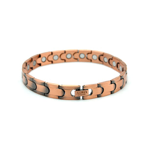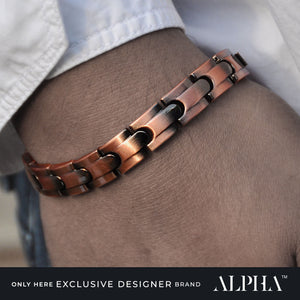 ALPHA LOGOIn solid copper Alpha exclusive, engraved with our brand with minimalist design and creative details. This elegant and masculine magnetic solid copper bracelet is a must have item. Understated and sophisticated this magnetic bracelet has a slimline style with a single chain of links that have distinctive shading of light and oxidised copper. This magnetic bracelet is the ideal choice if you are after a more modest looking therapeutic bracelet that goes with any look or style. This designer pure solid copper bracelet is only available on our site and not available to buy anywhere else. ...
