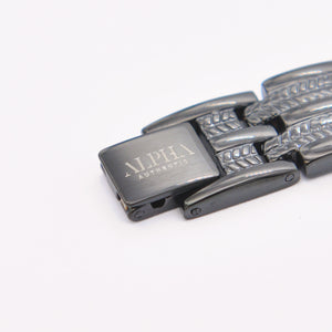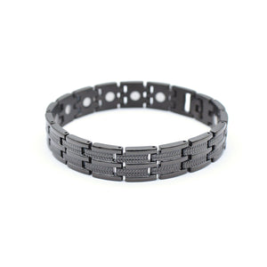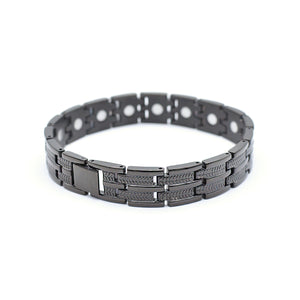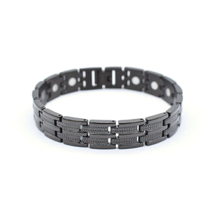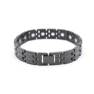 Similar to our Hadrian bracelet this magnetic bracelet combines all the features of the silver version but in a matt black titanium making all the detail stand out even more. This textured magnetic bracelet for arthritis is super suave, elegant and stylish if you like an understated look with a bit of uniqueness then this one’s for you. This striking detailed bracelet is easily shortened to fit any size or wrist comfortably. Sports a strong fold over clasp to keep it secure.