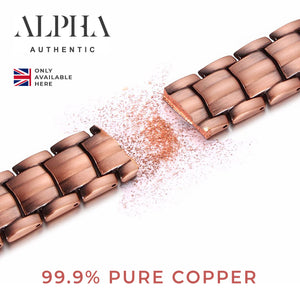 Exclusively engraved with our Alpha logo this unique and artistic mens solid copper magnetic bracelet is an original and creative wrist piece. Plain narrow copper links are placed alongside feather detailed copper links to create a visually stunning solid copper bracelet. This striking detailed bracelet is easily shortened to fit any size or wrist comfortably. Sports a strong fold over clasp to keep it secure. This exclusive bracelet is only available on our site and not available to buy anywhere else.