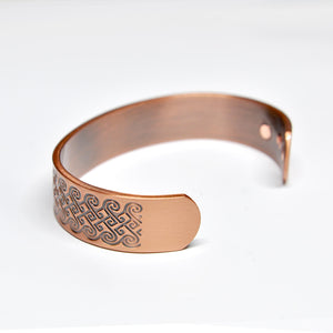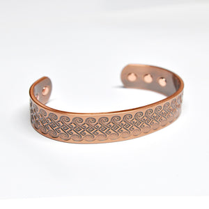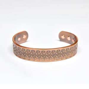 Another Celtic inspired bracelet, the spiral design on this copper magnetic bracelet is adapted from the Celtic triple spiral also very similar to a wave design. This quirky and bold design adds a natural look to this masculine magnetic bracelet. The contrast of the copper and oxidised copper makes the bold design stand out, a very artistic copper bracelet for men.