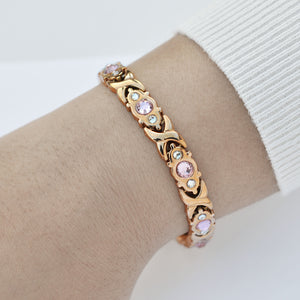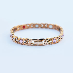 This unique stainless steel bracelet has a beautiful circular pattern and is bejewelled with pink sapphire style stones and white diamante stones. This stunningly crafted health bracelet is magnificent to look at and has all the benefits of magnetic therapy and the sturdiness of stainless steel rolled in to one. A classic magnetic bracelet for ladies that has a timeless appeal.